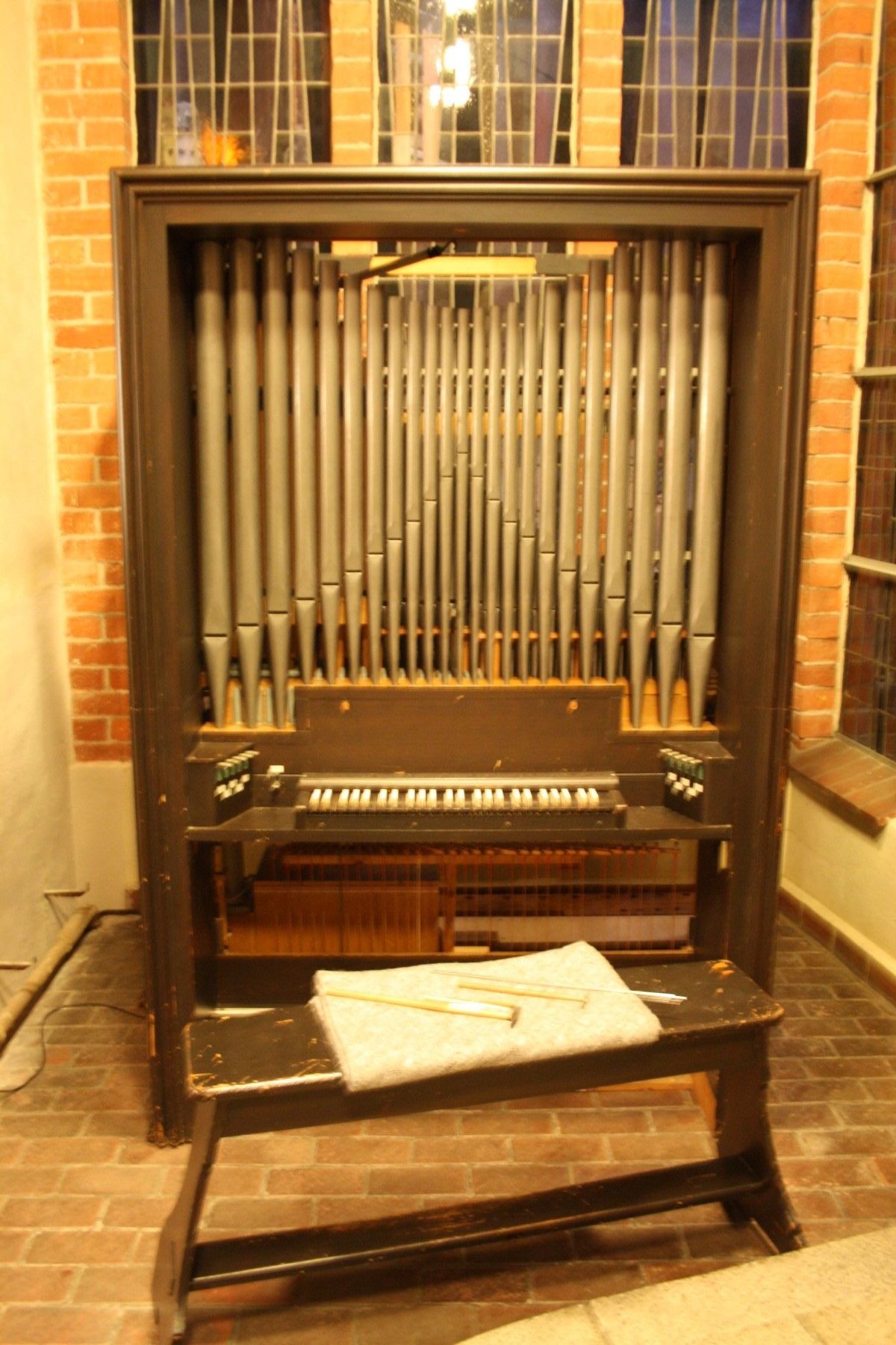 Gut vier Jahre ist es nun schon her, daß der KGR beschlossen hatte, die Orgel in der Winterkirche zu ersetzen. Seit dem Bau dieser Orgel litten die Organisten unter konstruktiven Mängeln. Herr Koball fand bei der Orgelbaufirma Alexander Schuke, die auch unsere große Orgel gebaut hat, ein gebrauchtes Instrument, das gut für die Winterkirche passen würde. Um diese Orgel jedoch auf der Empore aufzustellen, wären einige Baumaßnahmen erforderlich gewesen. Alle Pläne und Genehmigungen waren so gut wie unterschrieben, da landete im Zuge der Gründung der Nordkirche alles auf anderen Schreibtischen und ward lange nicht mehr gesehen. Schließlich sollte alles wieder ganz anders aussehen und das Verfahren zog sich weiter in die Länge. Die alte Orgel war längst abgebaut und zwei Winter erklang in den Gottesdiensten nur das E-Piano. Herr Koball hielt all die Jahre Kontakt zu Herrn Schuke und so ergab sich in einem Gespräch im Herbst, dass für die seitlichen Zugänge zum Orgelinneren gar nicht so viel Platz benötigt werde, wie immer angenommen. Folglich war es nun doch möglich, die Orgel vorn links im Altarraum aufzustellen - ohne Bauarbeiten! Und dann ging alles ganz schnell. Vom 8.-10. Dezember waren zwei Orgelbauer der Firma Schuke vor Ort und haben die Orgel aufgebaut. Am dritten Advent erklang die Orgel zum ersten Mal. Rund 400 Pfeifen in 4+2/2 Manualregistern und einem Pedalregister mit dem schönen Namen Pommer werden in Zukunft die Gottesdienste in der Winterkirche begleiten. Am 4. Januar wurde die Orgel in Dienst gestellt. Wir freuen uns alle sehr.